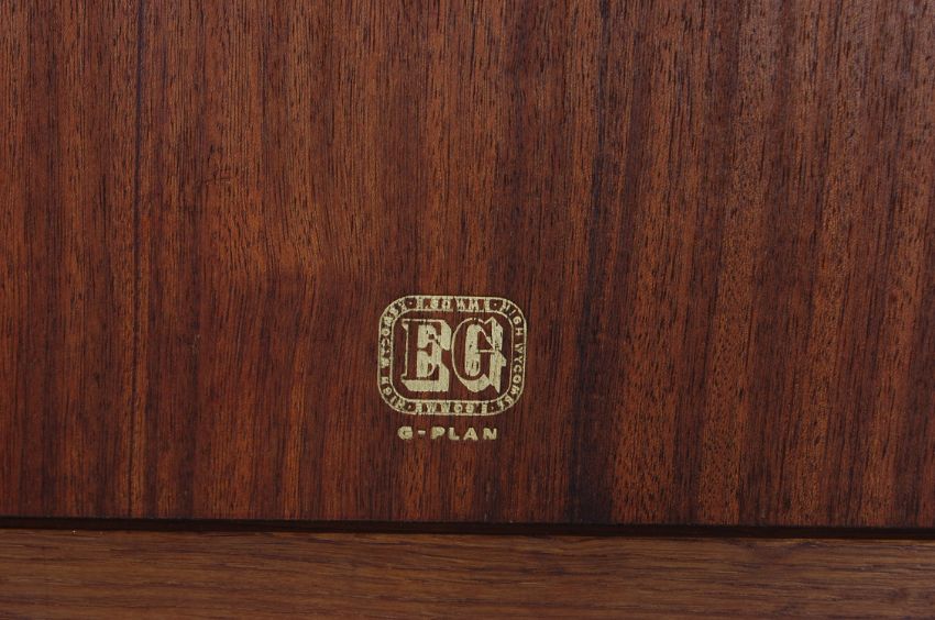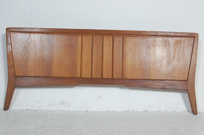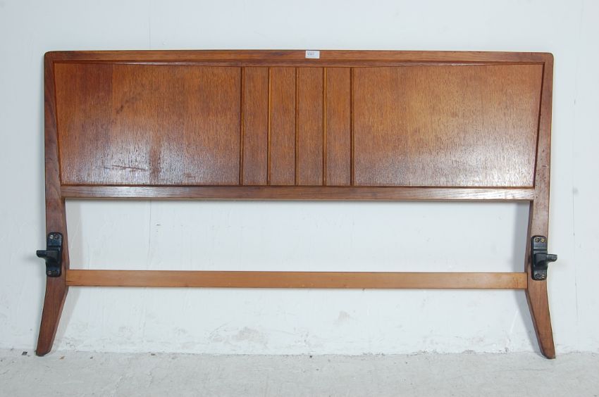 Ernest Gomme G Plan - a vintage retro mid 20th century Brandon range double bed. The bed comprising of headboard, footboard and two metal side runners. Makers gold stamp to the back. 85cm h x 144cm w