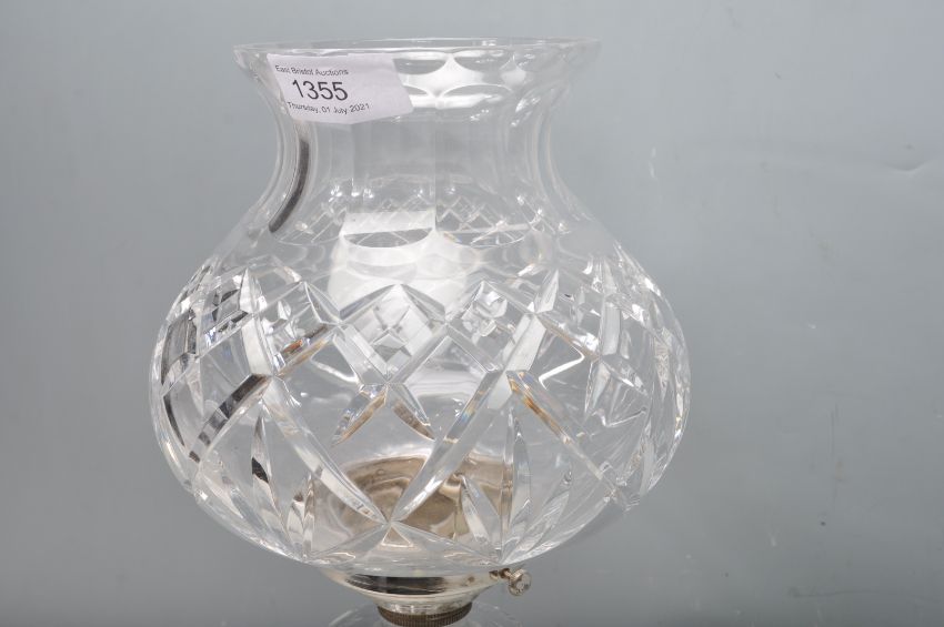 A vintage 20th century Waterford style lead crystal glass lamp having a waisted shade raised on a tapering base with lattice work decoration throughout. Measures 40cm.