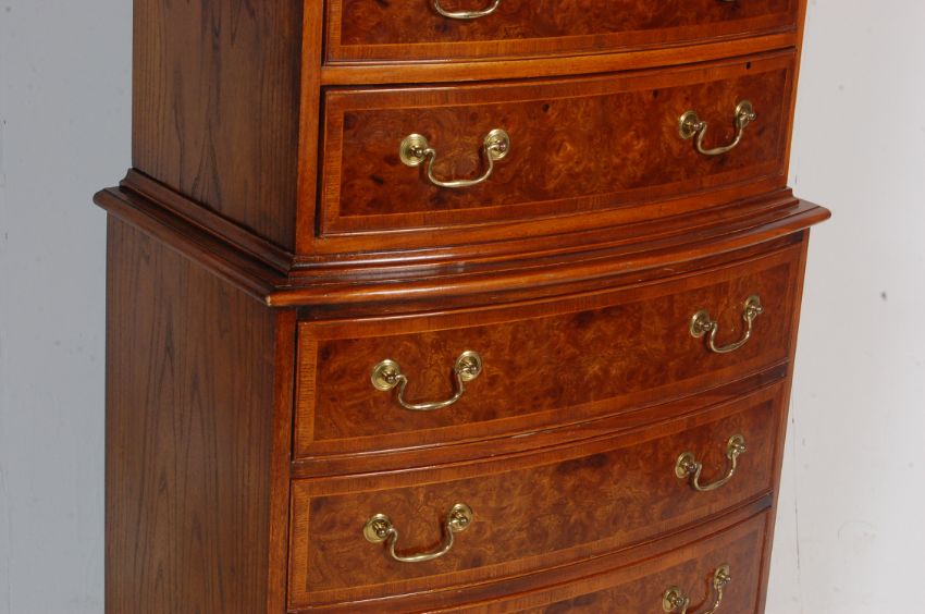 A contemporary Georgian antique style bow front tall boy chest on chest of drawers, each chest having four drawers each having walnut panels to the front of each with twin brass pull handles raised on bracket feet. 158cm h x 78cm w x 45cm d
