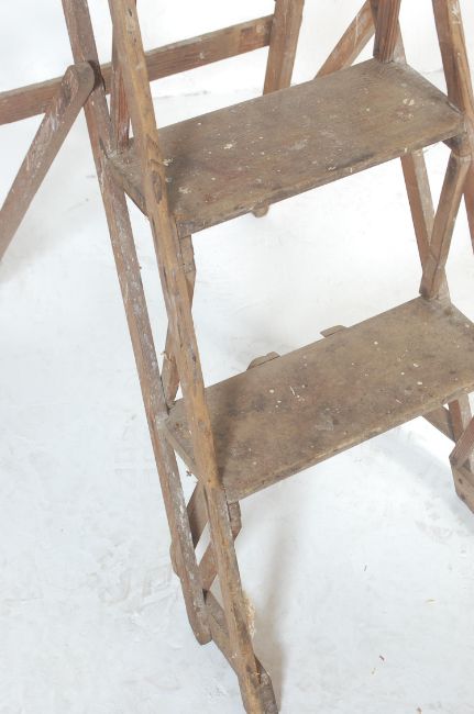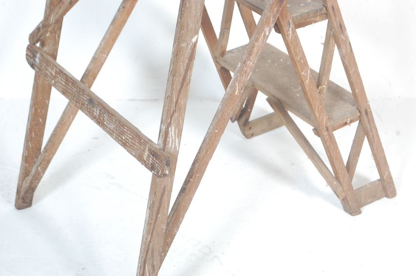 A pair of mid 20th century wooden A-frame ladders. The ladders having graduated steps and wooden frame along with a similar wooden A-frame ladder. 108cm h x 38cm w x 14cm d