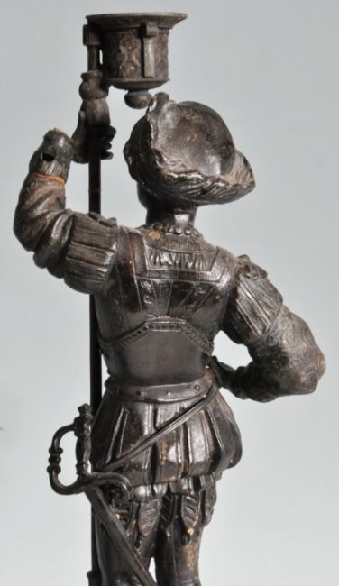 A pair of early 20th century spelter figurines of two continental soldiers holding weapons raised on socle bases. A/F. Measures approx.: 44cm high.