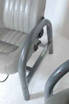 After Ron Arab - A pair of vintage retro 1970’s Top Gear style armchairs / easy chairs / man cave chairs. The chairs being made of front Jaguar car seats in grey leather set in a tubular metal frame with curved armrests raised on cylindrical legs. 120cm h x 67cm w x 70cm d