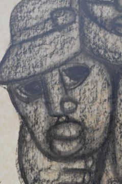 A retro vintage 20th Century 70’s South African abstract charcoal drawing / painting on card depicting two stylized abstract figures huddled together. Signed Kwame to the bottom left. Set within a mid-century metal frame and being glazed. Measures approx; 65cm x 53cm.