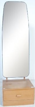 A vintage retro floor standing cheval mirror having a single drawer to the teak wood base with full length mirror above.