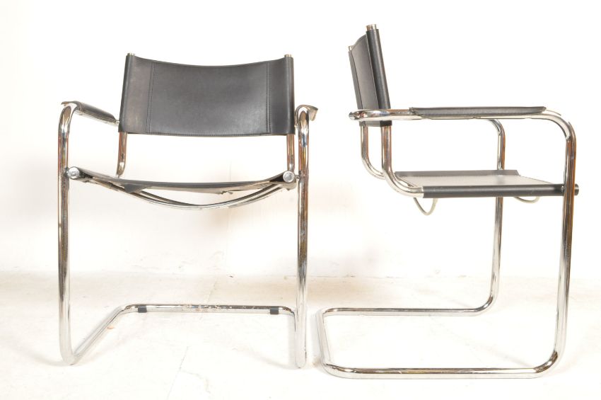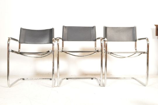 A set of three 20th Century Italian retro style cantilever carver dining chairs / armchair in the manner of Matteo. Each chair of polished tubular aluminum framed construction with black leatherette back and seatrest. Each measures approx; 80cm x 57cm x 56cm.