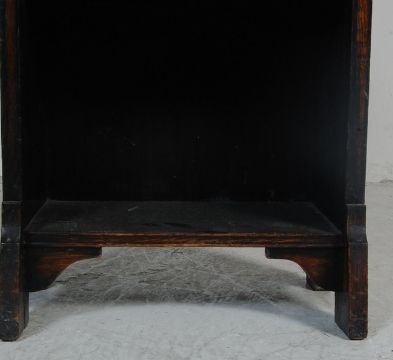 A Victorian 19th century tall Arts & Crafts dark oak open window bookcase cabinet with six shelves and arched cornice atop, all in the manner of Liberty of London.