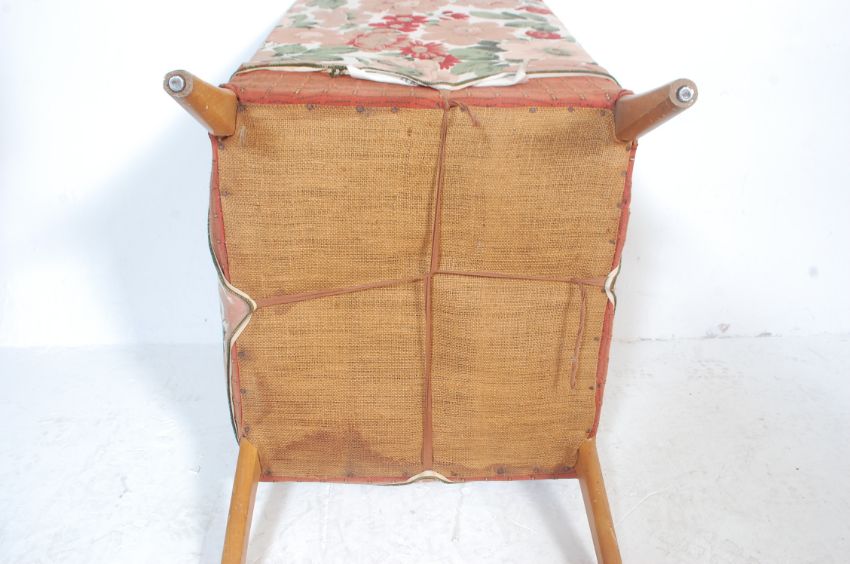 A mid-century retro vintage chair being raised on angular legs with upholstered open arm frame having later chintz cover. 92cm h x 54cm w x 22cm d