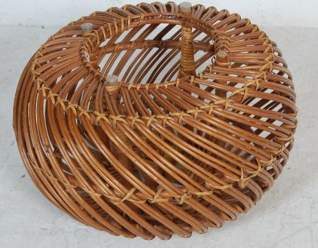 An early 20th century wicker stool / foot stool. The stool of a circular / UFO form with spirals waving raised on small feet.  32cm h x 48cm w x 48cm d