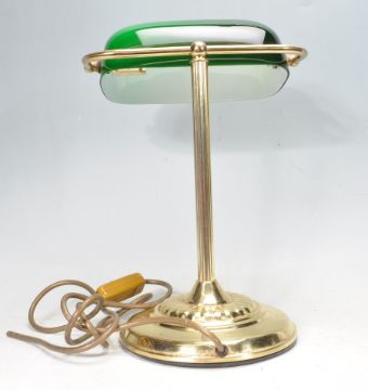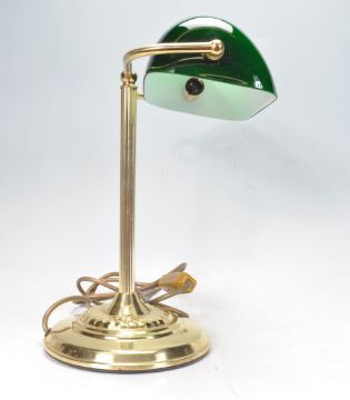 A vintage 20th Century bankers desk lamp having an adjustable green glass shade raised on a brass support and repousse decorated brass base. Condition: Good over all. No major damage just wear and tear. Sold as untested. Measures 35 cm Tall