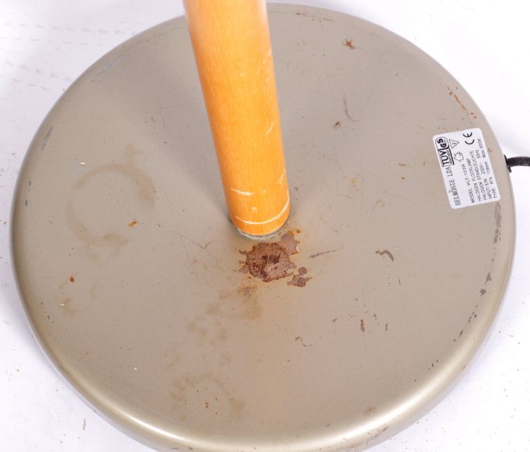 Belmonte LDA - Model HLF - A retro vintage late 20th Century floor lamp / reading light having a conical shade raised on twin tubular bar over cylindrical beech wood column set to a circular base. Label present. Measures approx; 160cm.