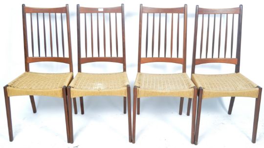 Nils Jonsson - Hugo Troeds - A good matching set of four retro mid 20th Century Swedish designer dining chairs / side chairs. Each of solid teak construction with turned spindle backrests with curved top and bottom rail with paper cord seat rest. Each being raised on curved straight leg supports. Condition; age related wear, overall good. Each chair measures approx;