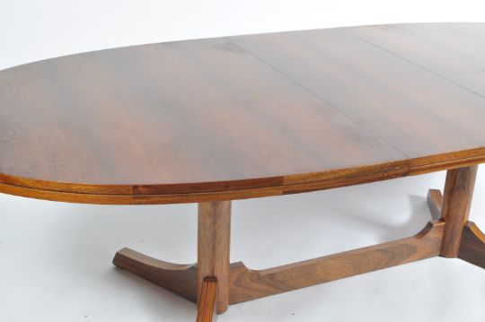 Robert Heritage - Archie Shine - A superb retro vintage mid 20th Century 1960's oval extending dining table. The thick oval top having channel detailing to the edge with all being supported by two turned pillars upon shaped trestle feet united by a low stretcher. The table come with one additional leaf. Condition; slight wear to the top, overall a great example. Measures approx; 72cm x 247cm x 110cm. When open measures approx; 282cm.
