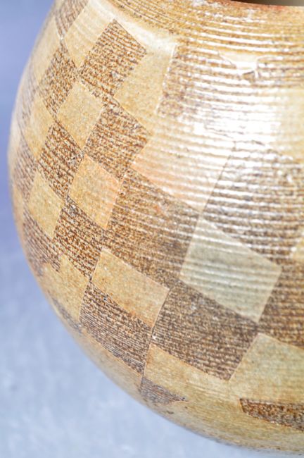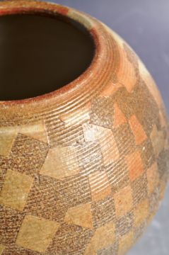 Andrew Osborne & Jennie Hale - Longham Pottery - An original retro vintage 20th century studio art pottery lidded jar / pot having a circular flat lid with bulbous globular body. Chequered decoration throughout with glazed and matte panels. Teardrop makers mark to base. No visible damage. Measures 17cm tall.