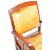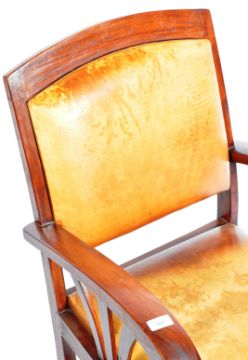 A 20th Century Art Deco style contemporary flame mahogany fireside club easy lounge armchair / arm chair having a burnt yellow leather cushioned back and seat with broad armrests, open railed sides and raised on block legs supports. Good condition, some fading to leather and some marks to the wood (arm) but overall structurally sound. Measures approx; 84cm x 58cm x 58cm.