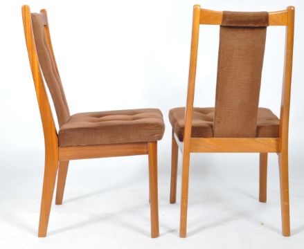 A set of four retro vintage 20th Century Danish influence teak wood dining chairs having shaped top rails with button cushioned back rest and seat raised on shaped teak legs. Each upholstered in a chocolate brown upholstery. All in good clean condition with some minor age related wear, one having a very small repair to the lower leg. A good set of chairs. Measures approx; 90cm x 47cm x 42cm.