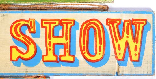 A collection of three original retro vintage mid 20th Century circus fairground ride painted wooden signs tags / sideshow gaff boards comprising ' House Of Fun in blue& Freakshow in green & blue' Both painted on wooden boards with bold lettering and borders. Great examples. Measures approx; 123cm x 30cm.