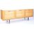 Graham Amey Furniture Ltd - An original retro vintage mid 20th Century high end British design golden oak / light oak sideboard credenza comprising a three drop / fall fronts with central vinyl record / magazine storage flanked by two cocktail cabinet units. Each with shaped pull handles. All raised on tapering ebonised black legs. Some staining to interior but overall in very good condition with some minor wear. Makers label to verso, Measures approx; 65cm x 178cm x 47cm.
