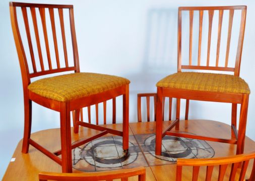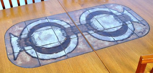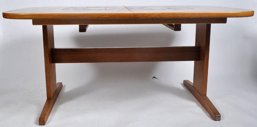 Gangso Mobler - A good retro vintage 20th Century Danish designer teak wood dining extendable table of round rectangular form set with tiles to the centre raised on trestle feet united by stretchers around. The extra leaf also bearing tiles to the centre with one being signed. Condition; overall good no visible damage, good example. Table measures approx; 73cm x 161cm x 94cm.