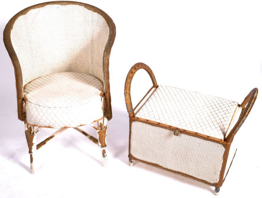 Lloyd Loom - Lusty - A vintage 20th Century English Designer woven easy / lounge chair / bedroom chair having spoon back backrests with drop in cushioned seat pads. Together with a matching ottoman blanket box having a cushioned top with all finished in a cream colourway with gilt highlights throughout and raised on stub cabriole legs. Condition; age related wear throughout. Chair measures approx 74cm x 57cm x 47cm.