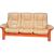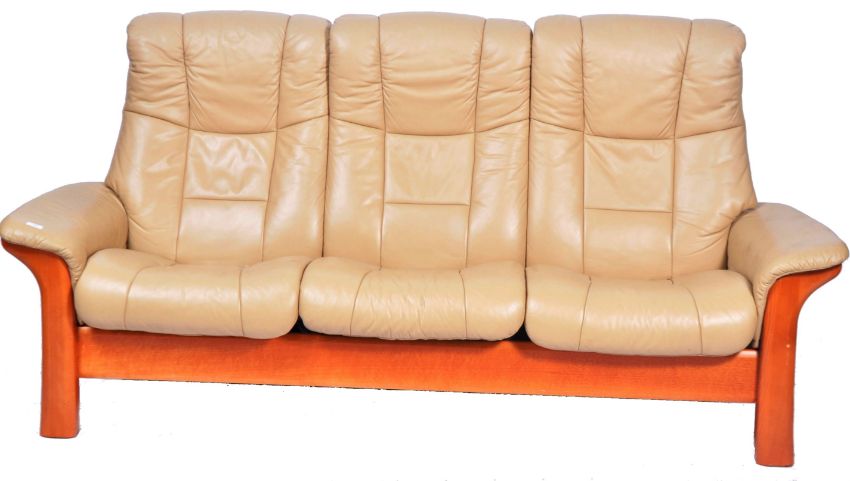 Ekornes Stressless - A contemporary Norwegian three seater reclining sofa settee in cream upholstered leather with thick padded armrests upon beech supports. Condition; wear to the leather, overall good. Measures approx; 102cm x 202cm x 73cm.