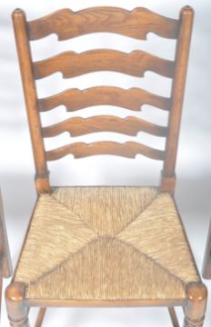 A large and impressive antique style 20th Century farmhouse oak refectory dining suite comprising a large refectory dining table with planked top, bulbous turned legs with block feet and 'H' stretcher along with a matching set of eight ladder back rush seated chairs (six standard chairs & two carvers. A great high quality reproduction set with some minor usage marks, . Table measures approx; 77cm x 212cm x 83cm. Chairs 107cm x 51cm x 47cm.