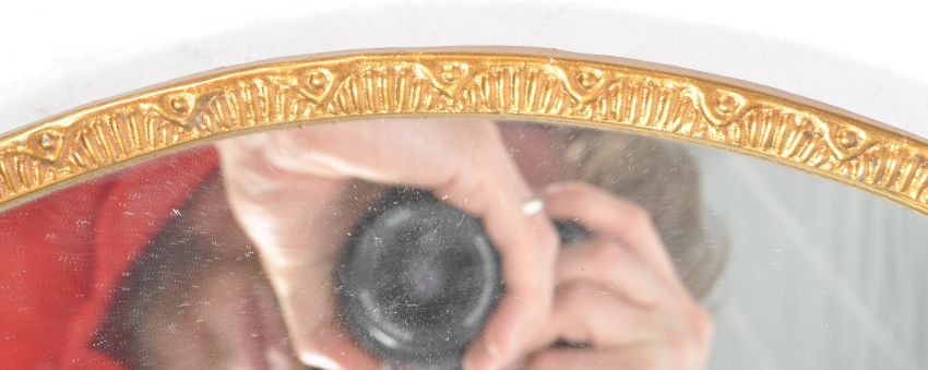 A vintage 20th Century gilt metal framed hanging wall mirror of circular form having a floral pierced decoration top with further patterned decoration to the rim. Gilt back panel. Condition; no visible damage. Measures approx; 45cm diameter.