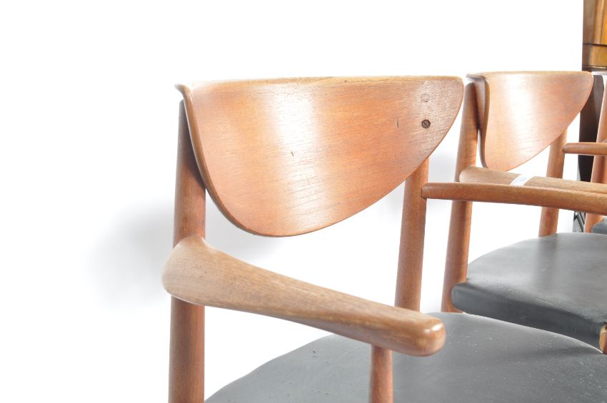 Peter Hvidt & Orla Mølgaard Nielsen - Søborg Møbelfabrik - Model 317 - A set of three retro vintage 1960's teak wood armchairs / arm chairs having a shaped panel back, angular armrests and black vinyl seats all raised on tapering cylindrical legs & supports. Age related wear in places with small repair to the backrest of one. Wear to undersides but overall great examples. Measures approx; Height: 30.5 in. (77.47 cm) Width: 20.5 in. (52.07 cm) Depth: 23.75 in. (60.33 cm) Seat Height: 17 in. (43.18 cm)