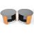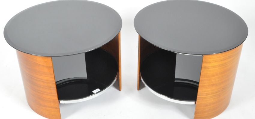 Jual San Furnishings -  Marino - A matching pair of contemporary minimalistic side / lamp occasional tables of stylish two tier form with each tier having piano black glass circular tops. Chrome supports with each being raised on bowed walnut panels. Condition; no visible damage, both in good condition. Each measures approx; 46cm x 57cm. Please see lots 418 and 434 for matching suite.