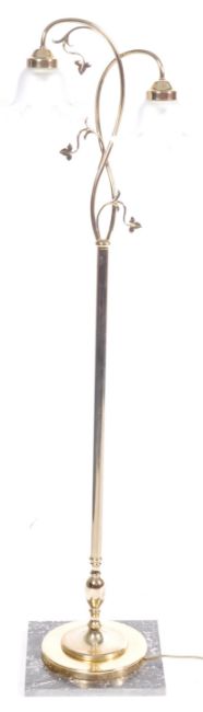 A retro vintage late 20th Century Hollywood Regency standard lamp light having twin branches with botanica decoration and glass shades. Raised on a cylindrical brass column over square marble base, Measures approx; 143cm tall.