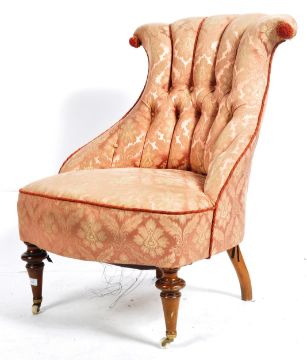An antique 19th Century Swedish upholstered shell back lounge chair / easy chair or bedroom chair having a shaped scroll shell back with button backrest. Upholstered in a rich damask pink silk with acanthus leaves and botanical detailing. All raised on turned wooden legs with white ceramic castors. In very good condition with some minor wear to the legs. A great example. Measures 91cm x 61cm x 70cm.