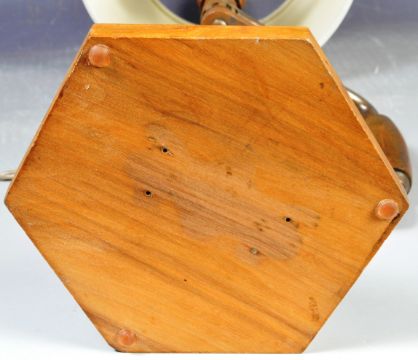 A retro vintage 20th Century English upcycled / repurposed hand held drill converted to a steampunk industrial table / desk lamp light. The bespoke lamp of typical form mounted upon a oak hexagonal base. Condition; sold as untested, age related ware, good example. Measures approx; 39cm x 17cm diameter.