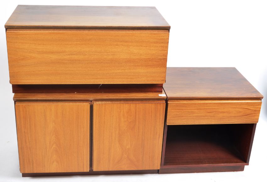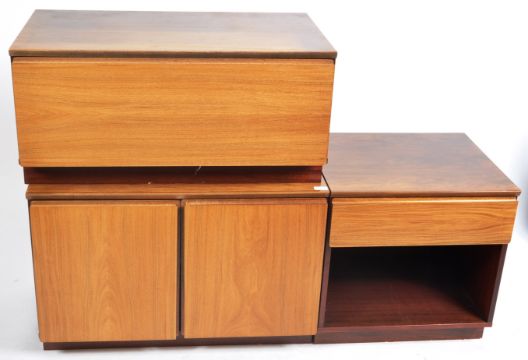 Johannes Andersen - Uldum Møbelfabrik - A set of three retro vintage 20th Century Danish rosewood low cabinets comprising of an open bedside with drawer, twin door cupboard and low drawer unit. Good condition with some minor ware. All with original labels to reverse. Largest measures approx; 56cm x 84cm x 46cm.