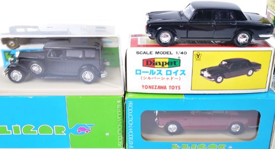A collection of x6 assorted boxed diecast model cars to include; Brooklin Models Lincoln Continental MKII, Japanese made Diapet  / Yonezawa Toys Rolls Royce Shadow and Lincoln Continental, French made Eligor 1975 Bentley T and Rolls Royce Limousine and Italian made Rio Models 1929 Torpedo. All models appearing mint, within original boxes.