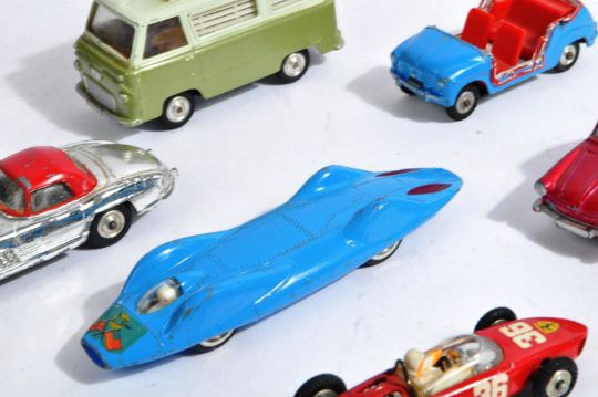 A collection of x11 vintage Corgi Toys diecast model cars and other vehicles to include; 300 SL Roadster, Standard Vanguard III, NSU Sport-Prinz, Renault Floride, Ford Thames Caravan, Ferrari Formula 1, E-Type Jaguar and others. Models ranging from  good to good+.