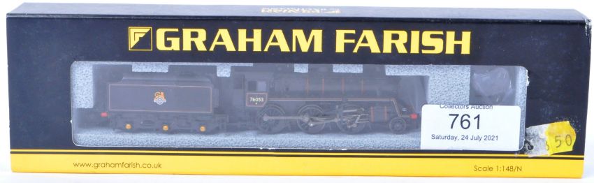 An original boxed Graham Farish made N gauge model railway trainset locomotive engine No. 372-650 Standard Class 4MT 2-6-0 British Railways lined black, early emblem. Highly detailed loco appearing mint, within original boxes.