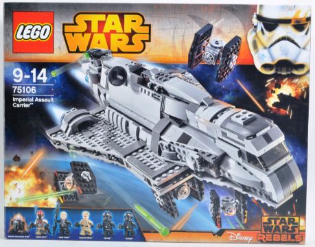 Lego Set - Lego Star Wars - 75106 - Imperial Assault Carrier - an original boxed Lego Star Wars set No. 75106 Imperial Assault Carrier. The now retired set appearing to be resealed to one side but the vendor assures us the set in 100% complete with instructions present.From a large private collection of Lego - the vendor assures us sets are 100% complete (where stated) but contents have not been checked by us. In the majority of cases boxes have been resealed to secure the contents (unless stated as 'factory sealed' in which case the set is unopened). East Bristol Auctions cannot guarantee completeness.