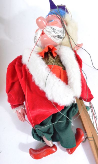 Two vintage 1960s Pelham Puppets Marlborough Wilts handmade and painted wooden puppets. The first puppet a sailor in navy blue and a brightly coloured face with strings attaching it to its rod so its Marionette can control it and the second of a King with a purple crown, red robe and green leggings, again with it's rod so it can be controlled. King in correct original box, Sailor puppet in an associated box.