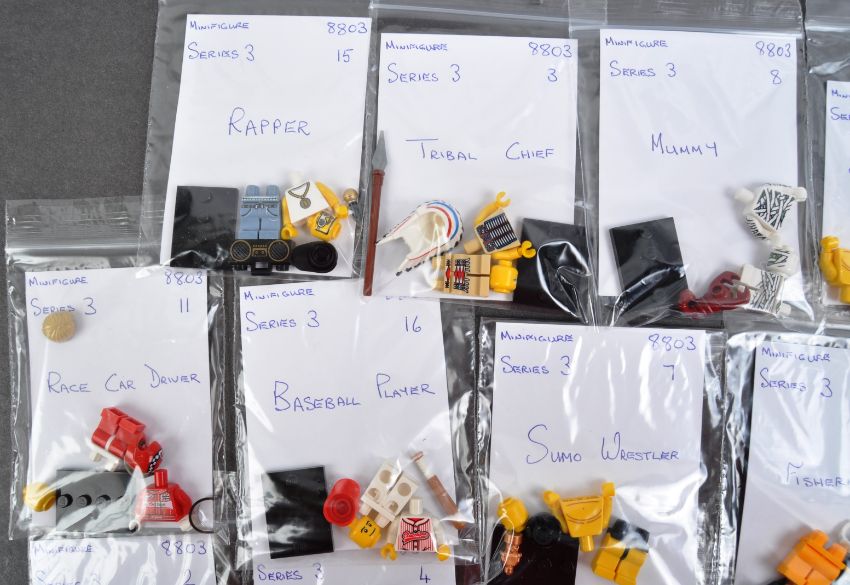 Lego Minifigures - a collection of x19 Lego ' Series 3 ' minifigures to include; 1. Fisherman 2. Aviator (x2) 3. Indian Chief 4. Samurai (x2) 5. Snowboarder w/ Helmet (x2) 7. Sumo wrestler (x3) 8. Mummy (x2) 10. Tennis player 11. Race car driver 13. Space Alien 15. Rapper 16. Baseball Player (x2). All minifigures 100% complete with accessory items. Unbagged.From a large private collection of Lego - the vendor assures us sets are 100% complete (where stated) but contents have not been checked by us. In the majority of cases boxes have been resealed to secure the contents (unless stated as 'factory sealed' in which case the set is unopened). East Bristol Auctions cannot guarantee completeness.