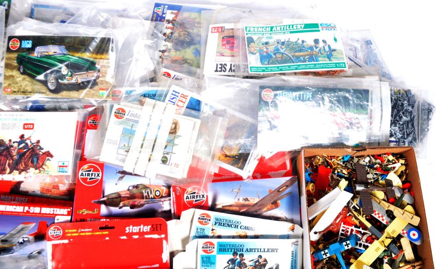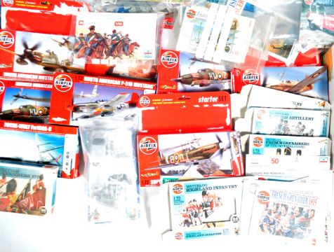 A large collection of assorted plastic model kits of various scales and makers of military and aviation interest. Makers predominantly Airfix and Italeri to include Spitfires, Hurricanes, Hawkers, Cutty Sark and more. Some used and unused examples, unchecked for completeness.