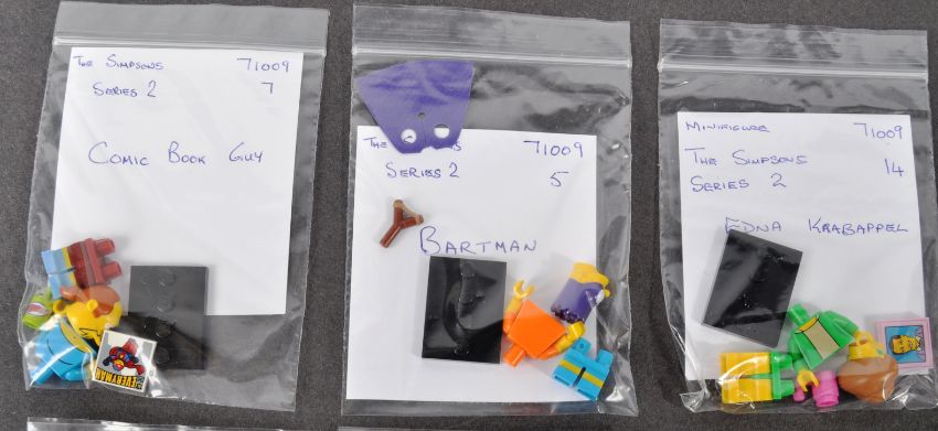 Lego Minifigures - 71009 - The Simpsons Series 2 - a complete set of Lego Simpsons Series 2 collectable minifigures comprising Maggie & Santa's Little Helper, Date Night Marge, Hans Moleman, Bartman, Martin Prince, Selma, Patty, Groundskeeper Willie, Waylon Smithers, Date Night Homer, Comic Book Guy, Dr Hibbert, Fallout Boy Milhouse, Edna Krabappel, Lisa With Snowball II and Professor Frink. All minifigures 100% complete with accessory items. Unbagged.From a large private collection of Lego - the vendor assures us sets are 100% complete (where stated) but contents have not been checked by us. In the majority of cases boxes have been resealed to secure the contents (unless stated as 'factory sealed' in which case the set is unopened). East Bristol Auctions cannot guarantee completeness.