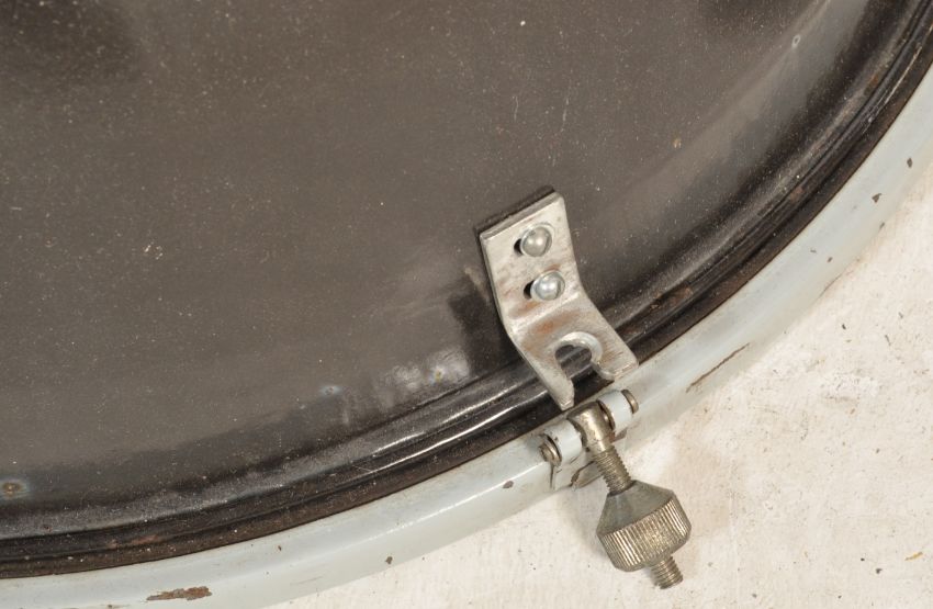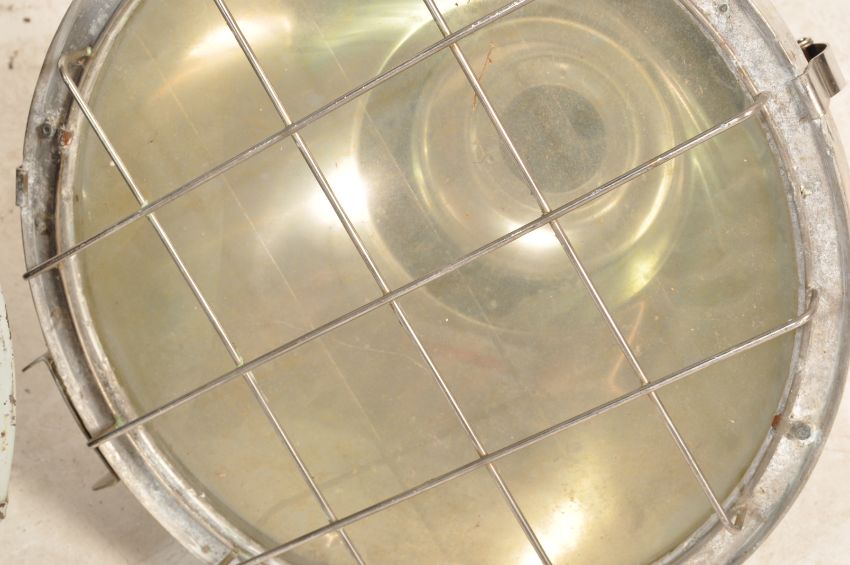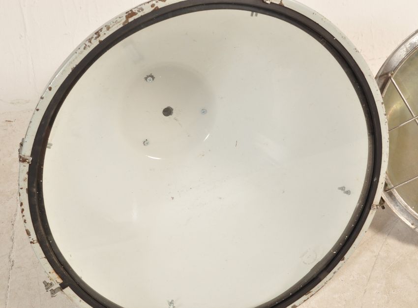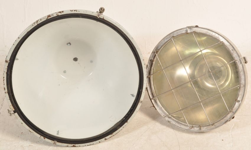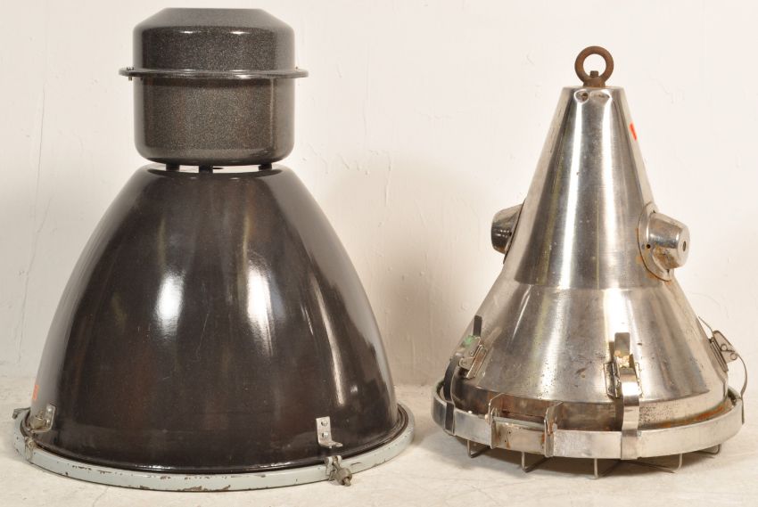 A pair of large 20th century circa 1970S industrial factory lights to include a large Thorax grey pendant light shade and another brushed aluminium light fitting of conical form. Both having glass benders to the bottom. Measures 59cm tall and 55cm in diameter.