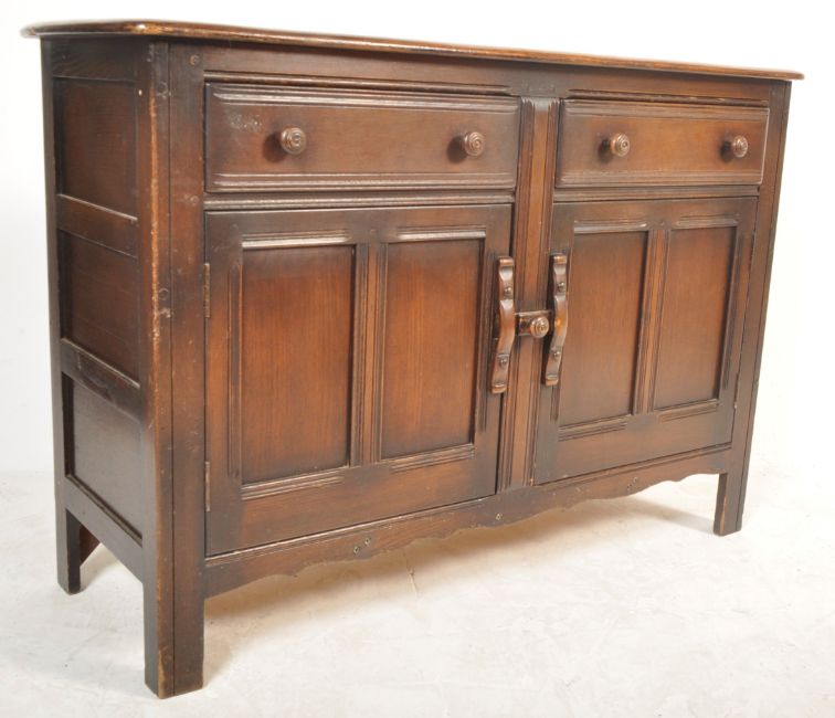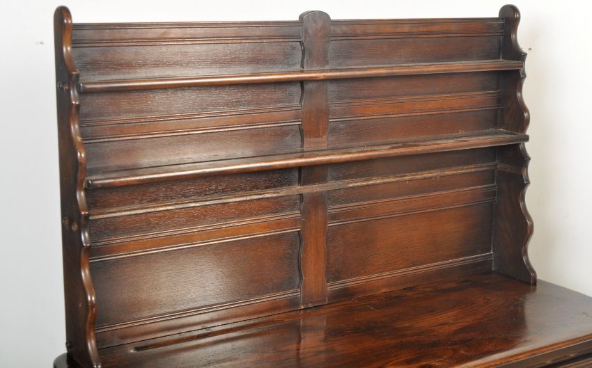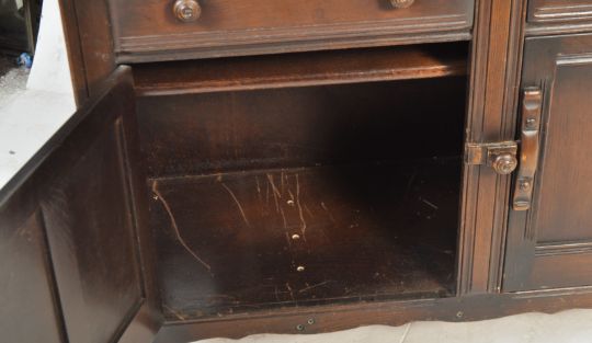 A early 20th century circa 1940's Ercol dark Jacobean revival - Old Colonial beech and elm wood dresser having cupboards and drawers to the base with plate rack atop. Measures 85cm high x 23cm wide x 46cm depth.