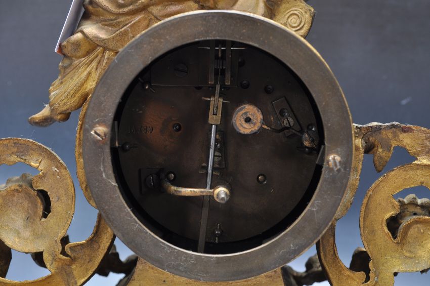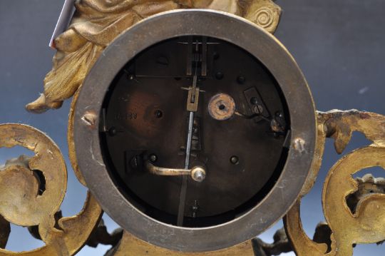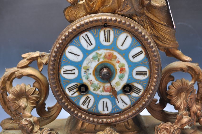 An early 20th century cast metal gilt French 8 day mantel clock. The clock having a blue enamel dial with Roman numerals to the chapter ring, brass movement with foliate motifs decoration to the base and a female figurine to the top. Measures 33cm x 26cm x 9cm