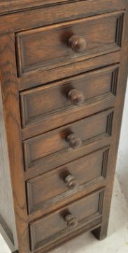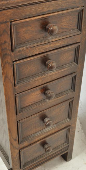 A 20th century oak Jacobean revival davenport desk having a hinged top with inner compartments, side drawers and front turned legs united by stretchers. Measures 82cm x 63cm x 52cm.