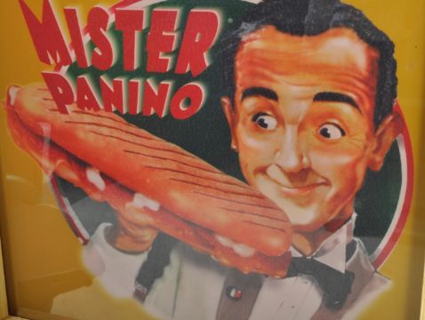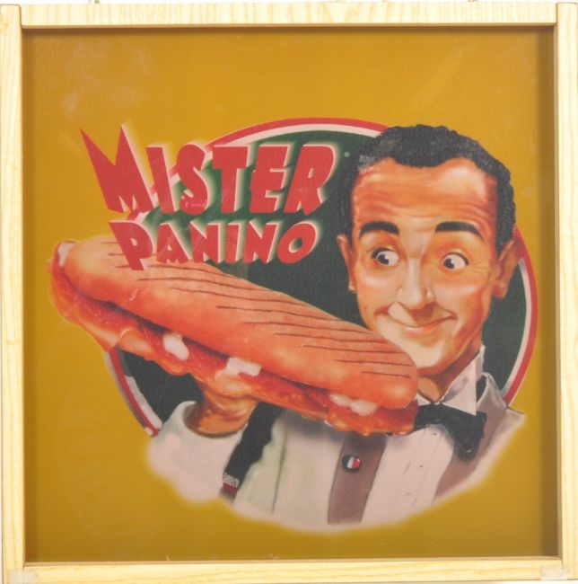 A contemporary 21st century point of sale shop display advertising light box for Mr Panino having a polychrome plastic front with wooden frame.
