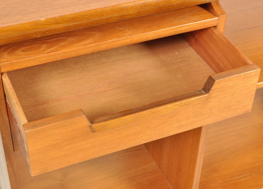 A vintage retro 20th century teak wood Hi-Fi entertainment unit of a rectangular form with open back, two drawer to the top left and fixed shelves raised on black metal hairpin legs.Measures, 83 cm H x 95 cm W x 44 cm D