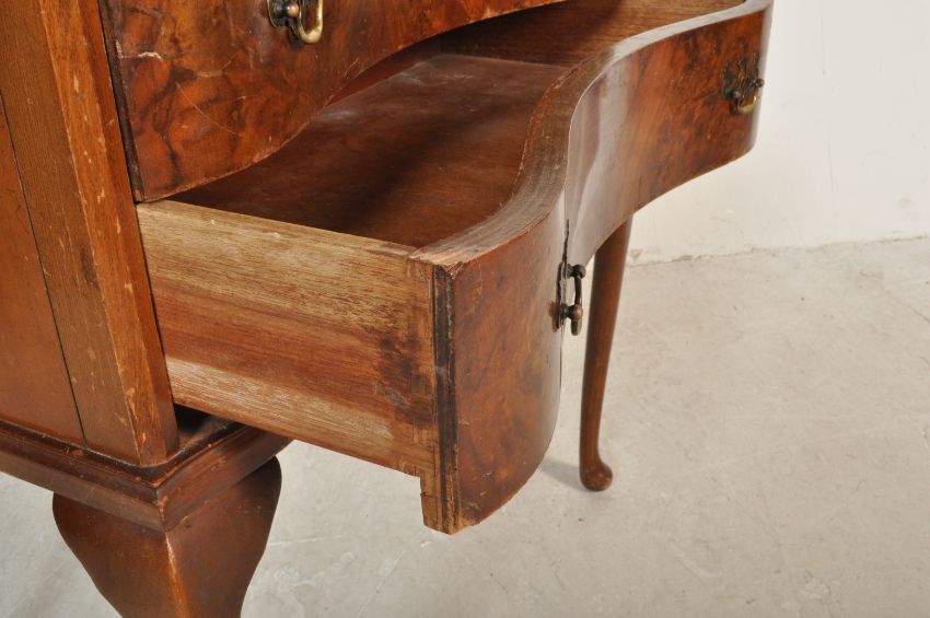 A mid 20th century 1950s queen Anne revival lowboy constructed from figured walnut. The front being of serpentine form with two drawers having brass swing handles and cabriole legs. Measures approx. 79cm x 70cm x 16cm.