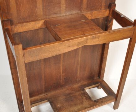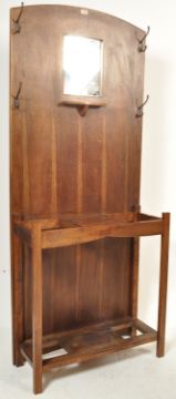 A 1920s Arts and Crafts oak hall stand having a mirror to the centre flanked by cost hooks with glove drawer below and umbrella / stick stand to each side. Measures approx. 183cm x 77cm x 31cm.