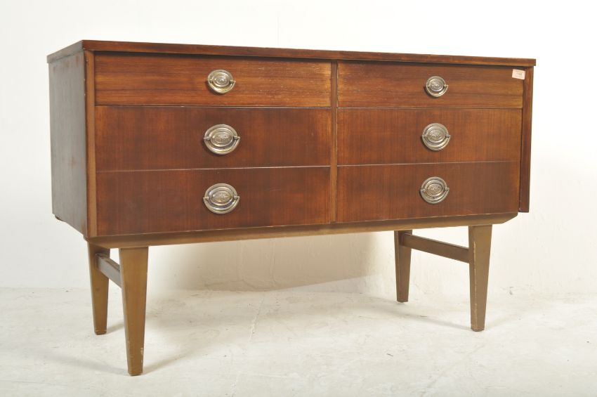 A vintage retro mid 20th century circa 1960's dark teak wood chest of drawers of a long form with six drawers and Victorian style brass swing handles raised on tapered legs. Measures 71cm high x 110cm wide x 46cm depth.