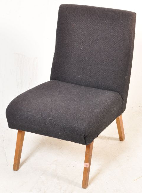 A  20th century circa 1980's  retro vintage bedroom chair having dark upholstery raised on tapered angular legs.Measures, 78 cm H x 48 cm W x 75 cm D